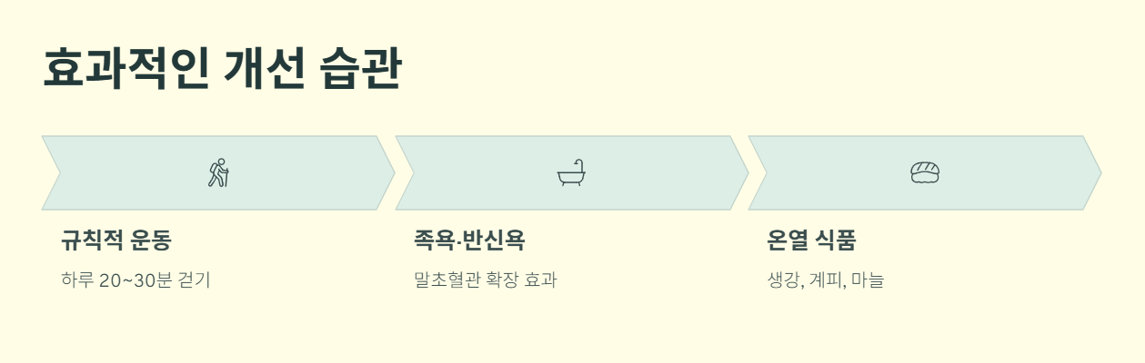 가벼운 걷기, 스트레칭, 하체 근력 운동은 혈액순환 개선에 큰 도움이 됩니다. 하루 20~30분 정도만 꾸준히 해도 효과를 볼 수 있습니다.