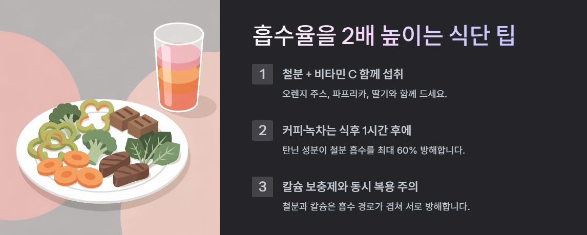 흡수율을 고려한 식단 구성이 중요합니다. 비타민 C와 함께 섭취해야 효과적입니다.