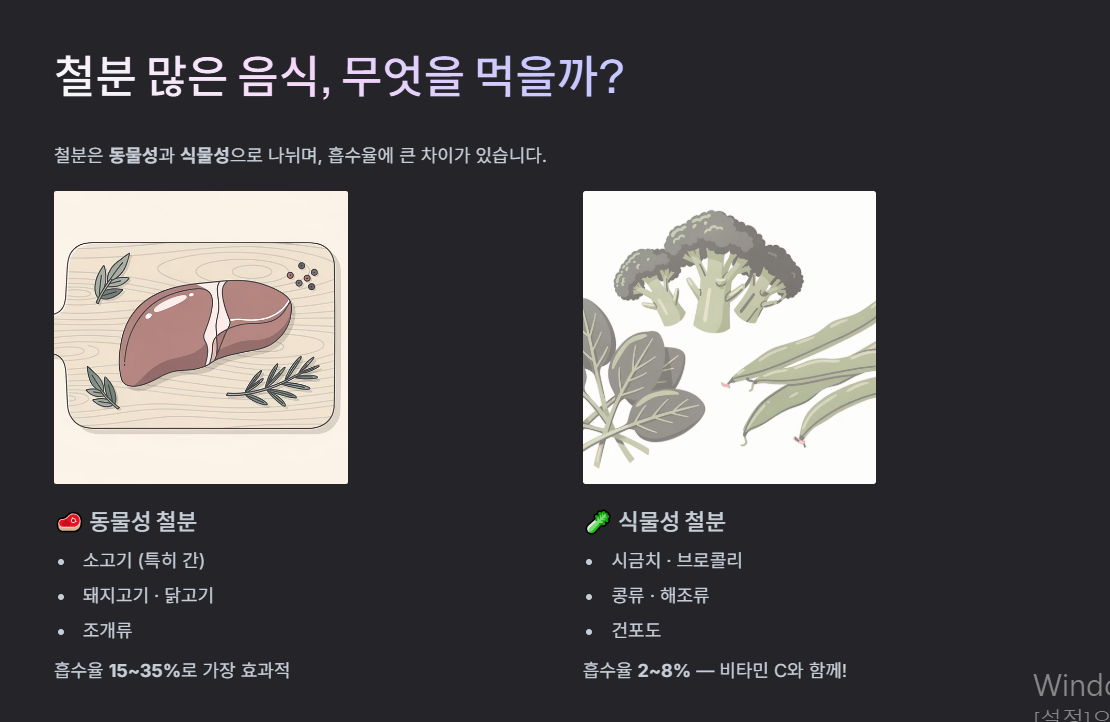 철분은 음식으로 충분히 보충할 수 있지만, 종류에 따라 흡수율 차이가 큽니다.