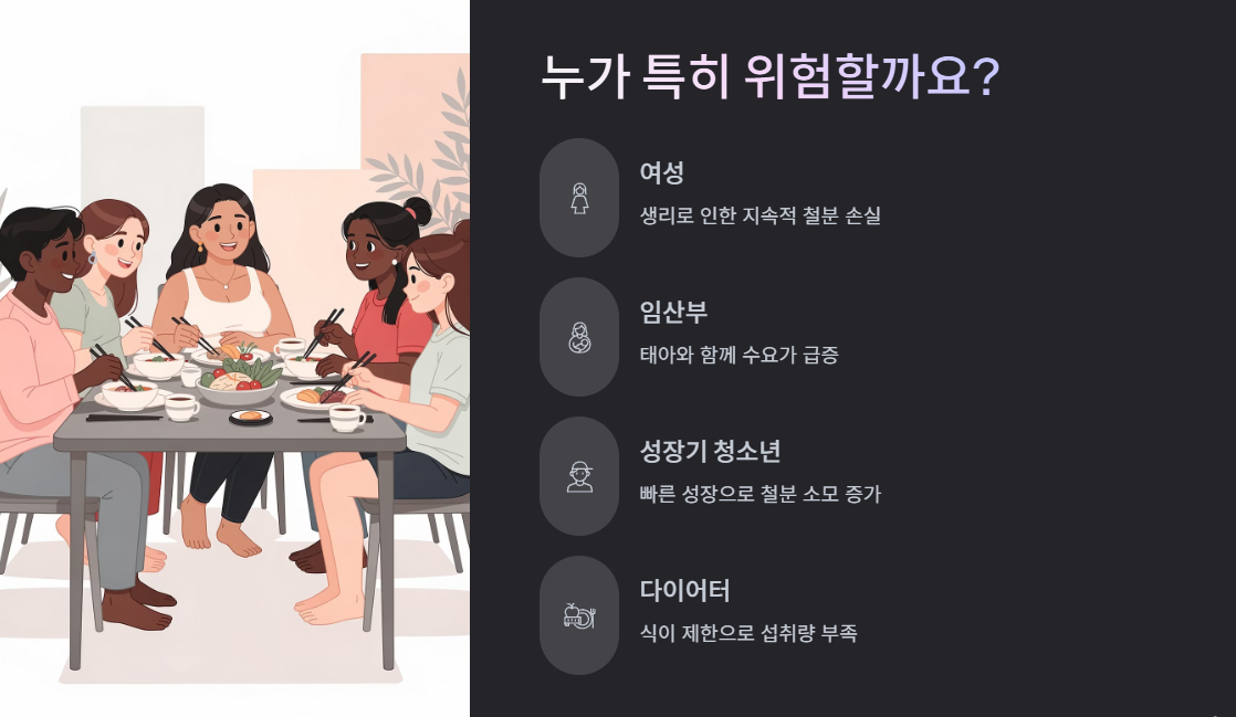 특히 여성, 임산부, 성장기 청소년, 다이어트를 자주 하는 분들은 철분 부족 위험이 높습니다.