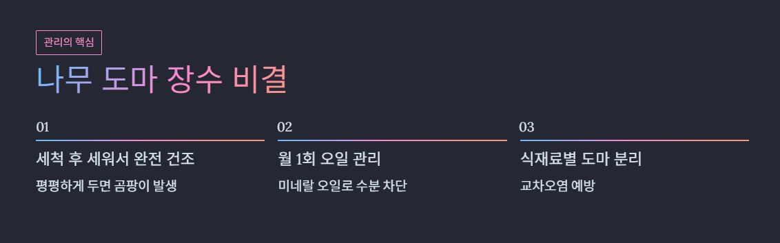 한 달에 1회 정도 미네랄 오일을 얇게 발라주면 수분 흡수를 줄이고 수명을 늘릴 수 있습니다.