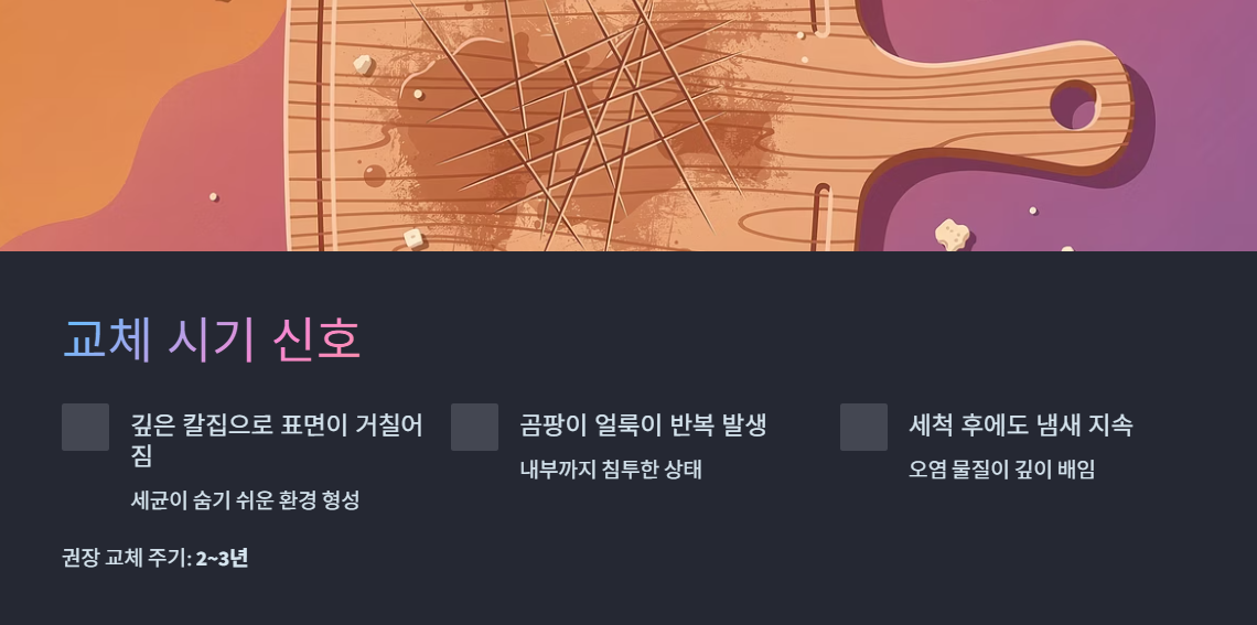 나무 도마에는 명확한 사용기한이 정해져 있지 않지만, 아래 신호가 보이면 교체를 권장합니다.