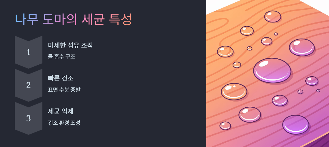 나무 도마는 미세한 섬유 조직 구조를 가지고 있습니다. 이 구조 때문에 물을 흡수하는 것처럼 보이지만, 동시에 표면의 수분이 빠르게 건조되면 세균이 오래 생존하기 어려운 환경이 됩니다.