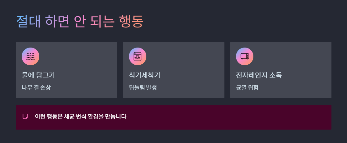 이런 행동은 나무의 결을 망가뜨려 오히려 세균 번식 환경을 만듭니다.