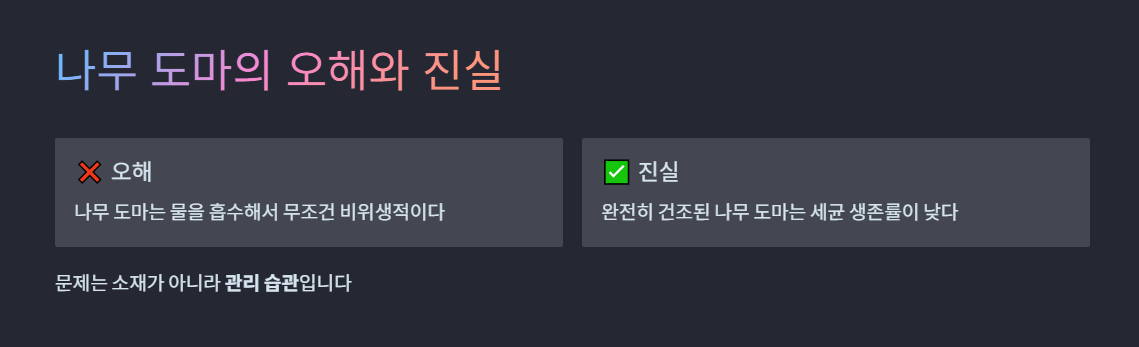 - ✔ 항상 젖어 있는 도마 → 세균·곰팡이 위험 증가