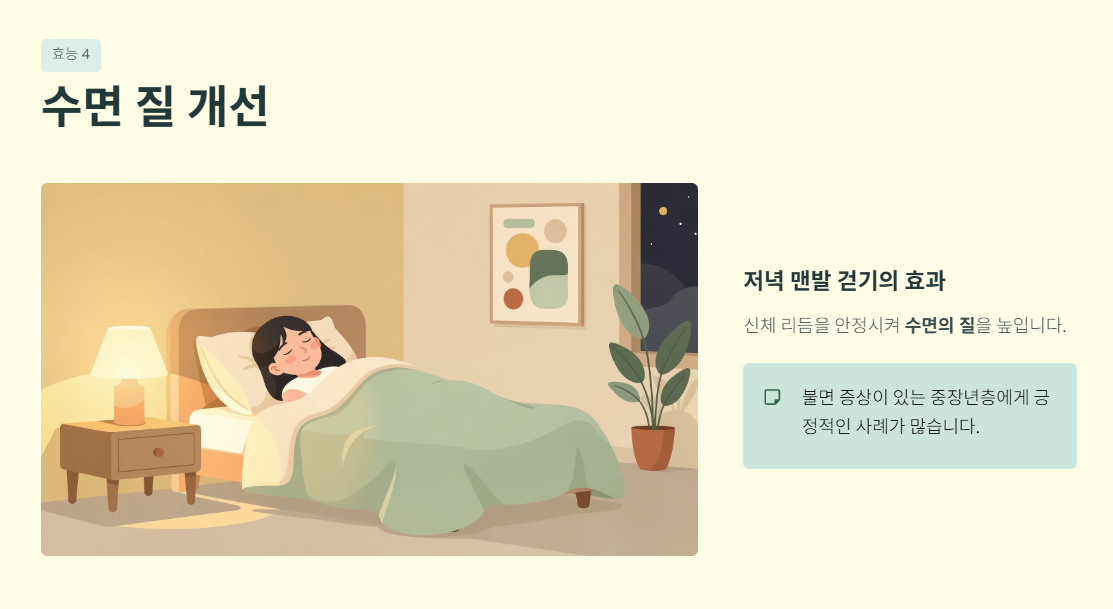 저녁 시간대 가벼운 맨발 걷기는 신체 리듬을 안정시켜 수면의 질 개선에 도움을 줄 수 있습니다. 특히 불면 증상이 있는 중장년층에게 긍정적인 사례가 많습니다.