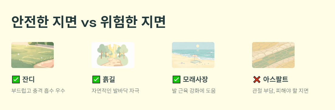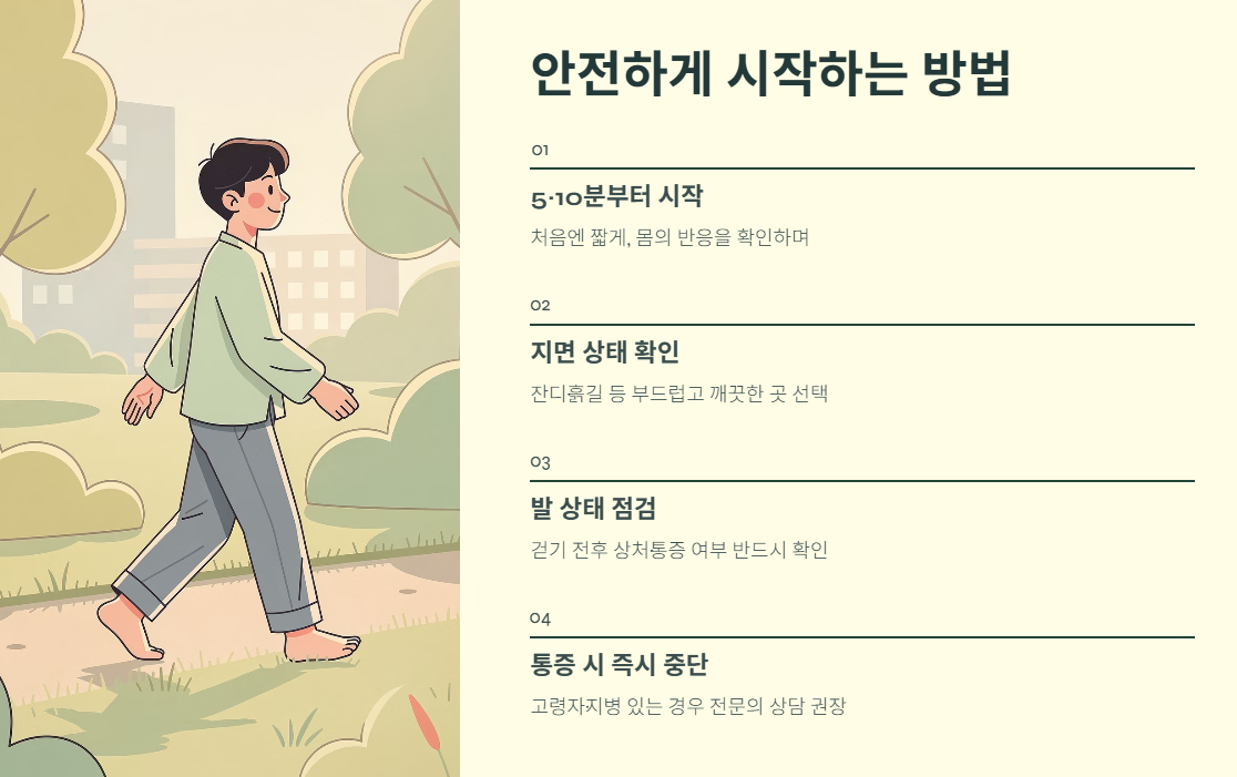 발 건강 상태, 나이, 지면 환경을 고려해 ‘짧고 안전하게’ 시작하는 것이 핵심입니다. 유행이 아니라 나에게 맞는 건강 습관으로 접근해보세요.