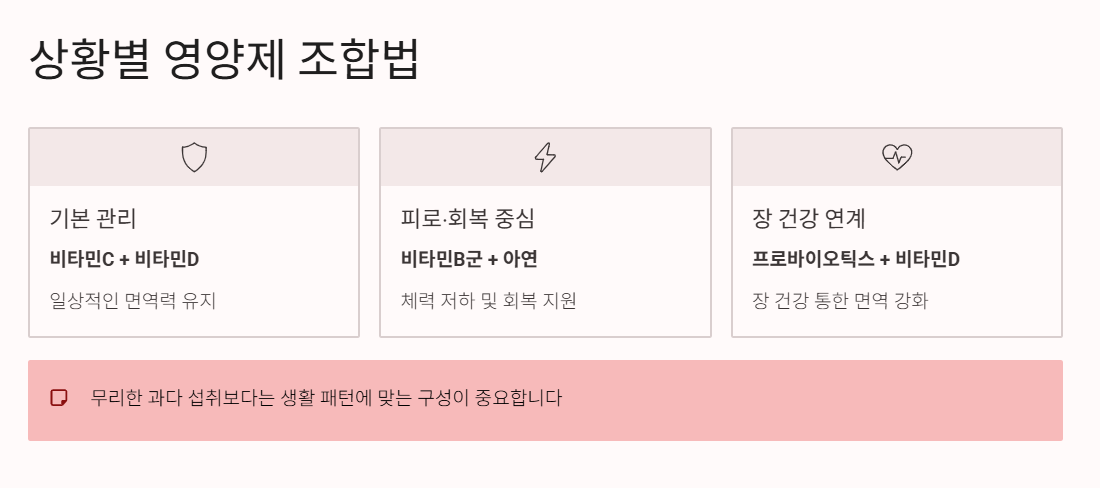 - 비타민C, D, 아연, 프로바이오틱스가 기본 구성