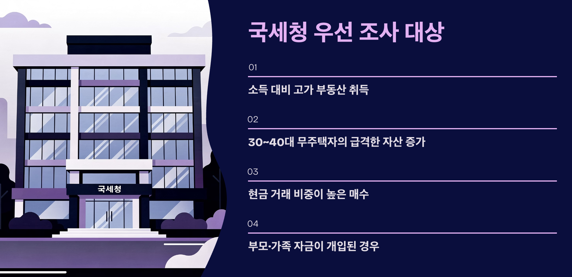 자금출처조사는 부동산 취득 시 사용된 자금이 합법적으로 형성된 소득인지 확인하는 절차입니다. 국세청은 다음과 같은 경우 우선적으로 조사합니다.