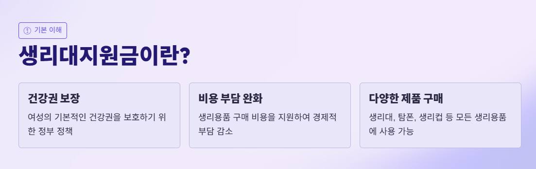 생리대지원금은 단순 지원금 이상의 의미가 있습니다. 생리용품 구매 비용 부담을 실질적으로 줄여주는 정책이기 때문에, **대상에 해당한다면 반드시 신청 후 혜택을 받아야 합니다.**