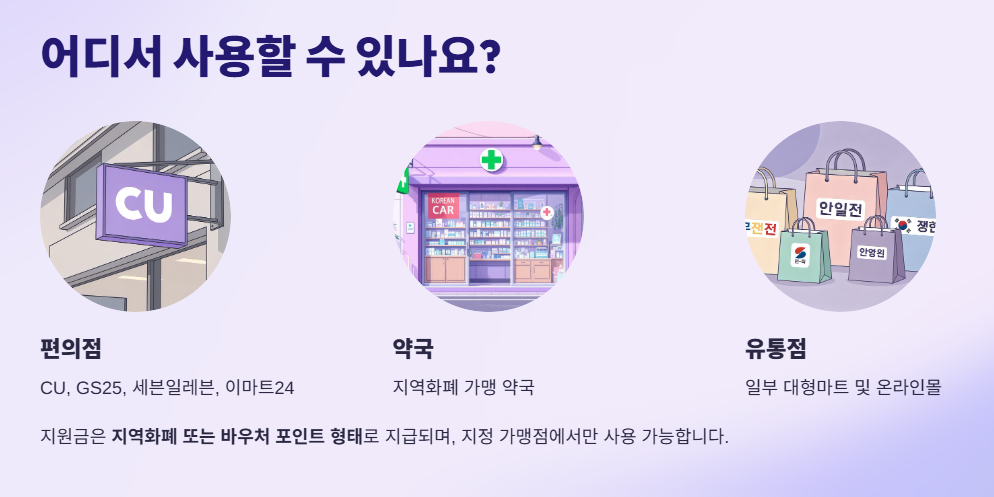 지원금은 대부분 **지역화폐 또는 바우처 포인트 형태**로 지급되며, 지정 가맹점에서만 사용할 수 있습니다.