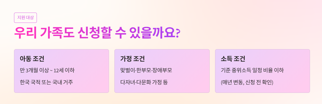 → 기본적으로 만 3개월~12세 이하 자녀를 둔 가정이라면 가능하지만 소득 및 양육 공백 요건을 확인해야 합니다.