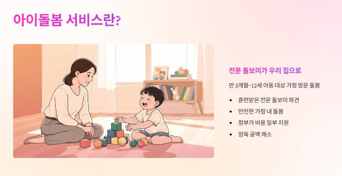 아이돌봄 서비스는 전문 돌보미가 만 3개월 이상 ~ 만 12세 이하 아동을 대상으로 가정 방문 돌봄을 제공하는 정부지원 서비스입니다. 맞벌이, 한부모, 다자녀 가정 등 양육 공백이 발생하는 경우 이용할 수 있습니다.