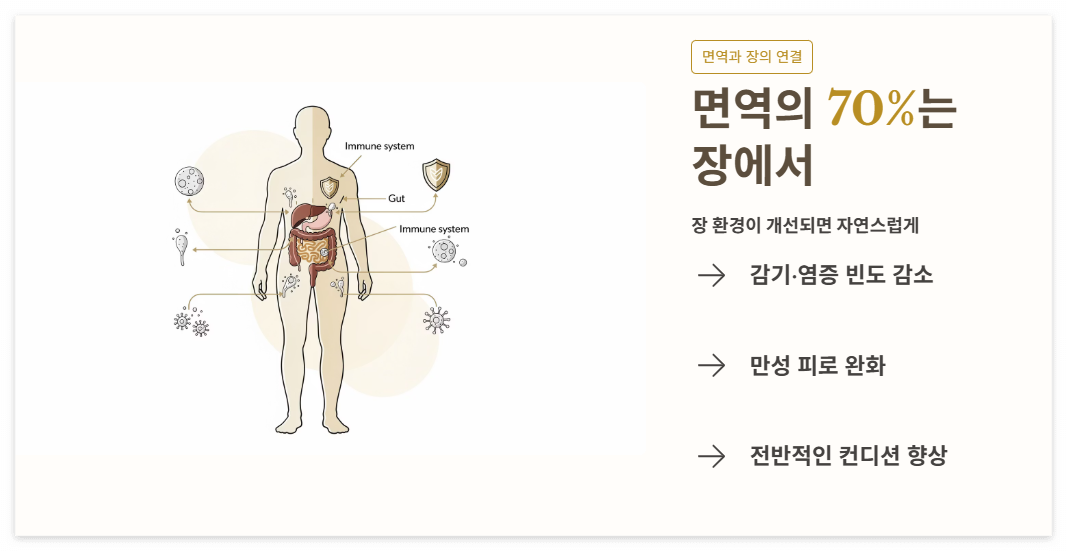 면역세포의 약 70%가 장에 존재합니다. 장 환경이 개선되면 자연스럽게 감기, 염증, 잦은 피로 증상이 줄어듭니다.