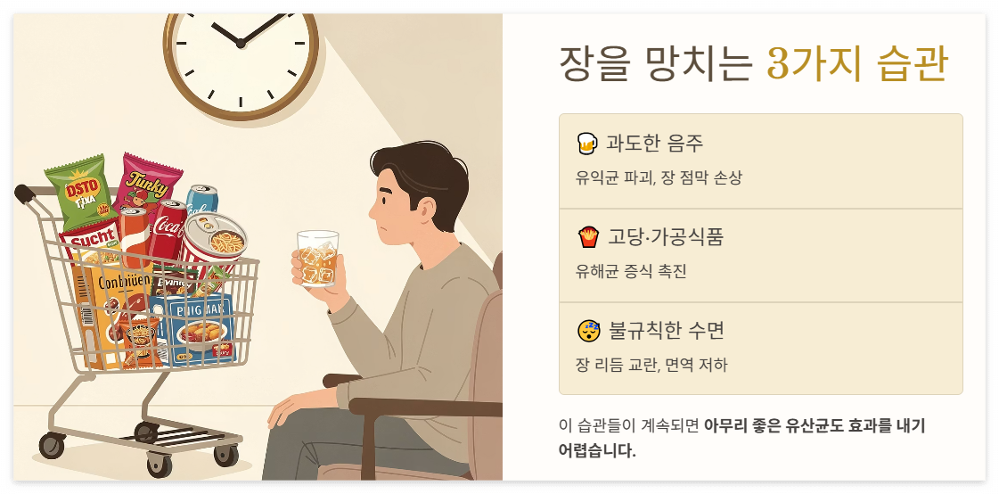 이러한 습관이 지속되면 아무리 좋은 유산균도 효과를 내기 어렵습니다.