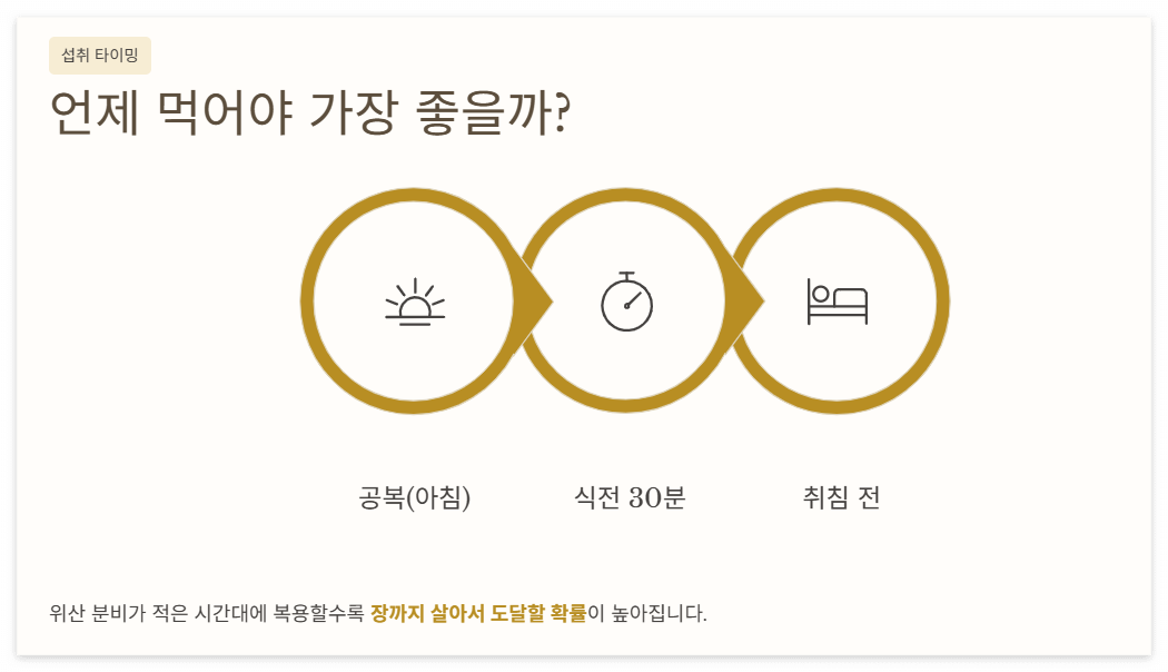 공복 또는 취침 전 섭취가 가장 이상적입니다. 위산 분비가 적을 때 섭취하면 장까지 도달할 확률이 높아집니다.