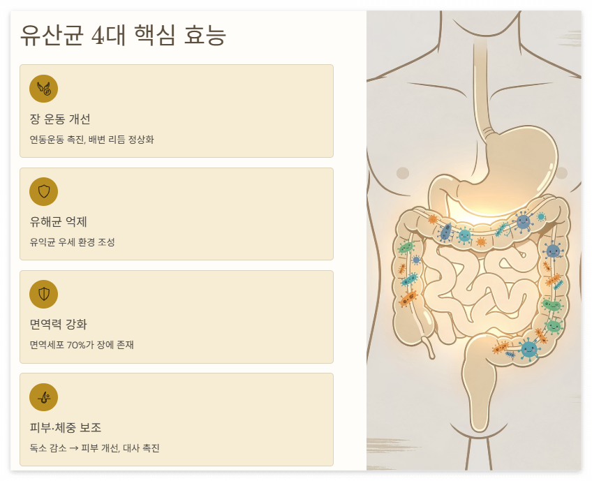 장내 독소가 줄어들면 피부 트러블 개선에도 긍정적인 영향을 주며, 일부 유산균은 체지방 감소와 대사 개선에도 도움을 줍니다.