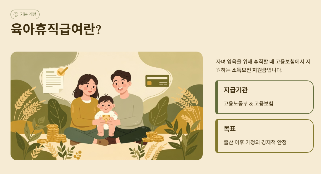 육아휴직급여는 근로자가 자녀 양육을 위해 휴직할 때 고용보험에서 일정 금액을 지원하는 제도입니다. 이는 단순 급여가 아니라 생활 안정을 위한 소득보전 지원금입니다.