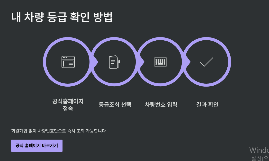 자신의 차량이 어떤 등급인지 확인하는 가장 정확한 방법은 공식 홈페이지를 이용하는 것입니다. 회원가입 없이도 차량번호만 입력하면 즉시 조회가 가능합니다.
