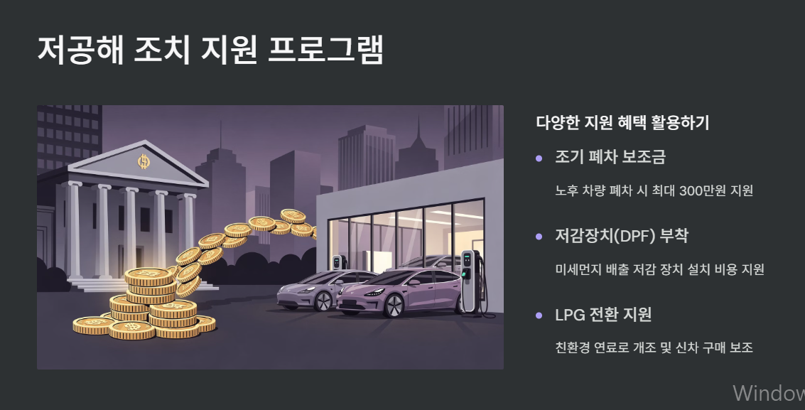 또한 노후 차량의 배출가스를 줄이기 위한 저공해 조치(조기 폐차·저감장치 부착) 지원 등도 이 제도를 기반으로 운영됩니다.