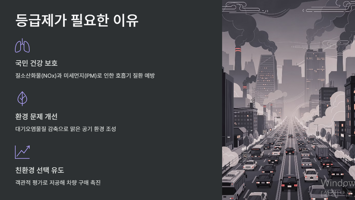 최근 미세먼지 문제로 인해 환경부는 자동차 배출가스 등급제를 도입하여 차량을 배출가스 기준으로 1등급부터 5등급까지 평가하고 있습니다. 이는 단순한 숫자가 아니라 운행 제한, 보조금, 세제 혜택 등 자동차 정책에 직접적인 영향을 줍니다.