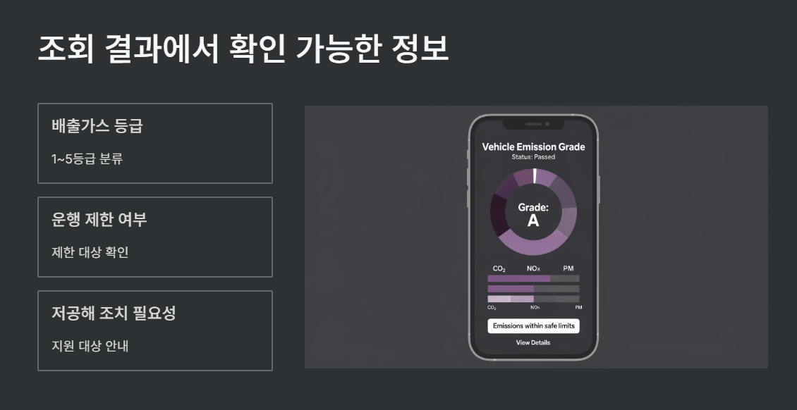 조회 결과에서는 등급뿐 아니라 운행 제한 여부, 저공해 조치 필요 여부도 함께 확인할 수 있습니다.