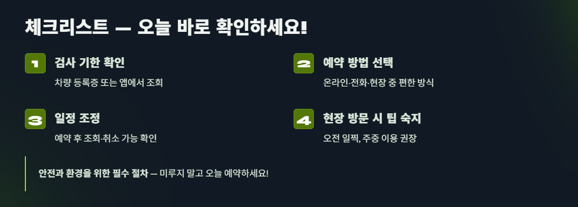 온라인 예약은 스마트폰 또는 PC에서 빠르게 완료할 수 있고 대기 시간을 줄이는 데 매우 효과적입니다. 한국교통안전공단에서 제공하는 검사 예약 시스템 또는 민간 앱으로 예약할 수 있습니다.