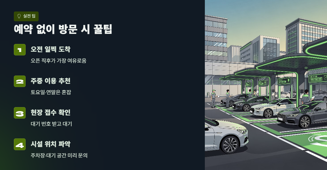 결론부터 말하면 예약 없이 방문 가능합니다. 다만 예약 차량이 우선 처리되기 때문에 대기 시간이 길어질 수 있습니다.
