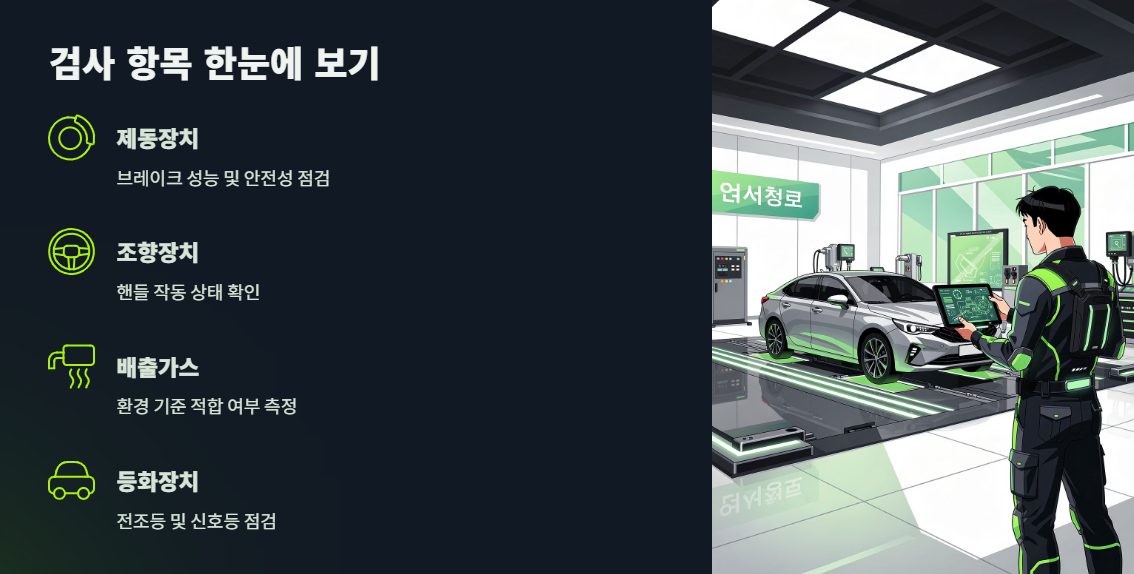 정기검사는 교통사고 예방과 환경 보호를 위한 필수 절차입니다. 검사에는 제동장치, 조향장치, 배출가스, 등화장치 등 주요 안전 항목이 포함됩니다.