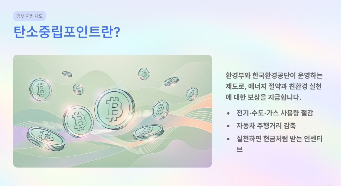 탄소중립포인트는 환경부와 한국환경공단이 운영하는 제도로, 일상생활 속에서 에너지 사용량이나 자동차 주행거리를 줄이면 그에 따른 보상을 포인트 또는 현금으로 지급하는 정책입니다.