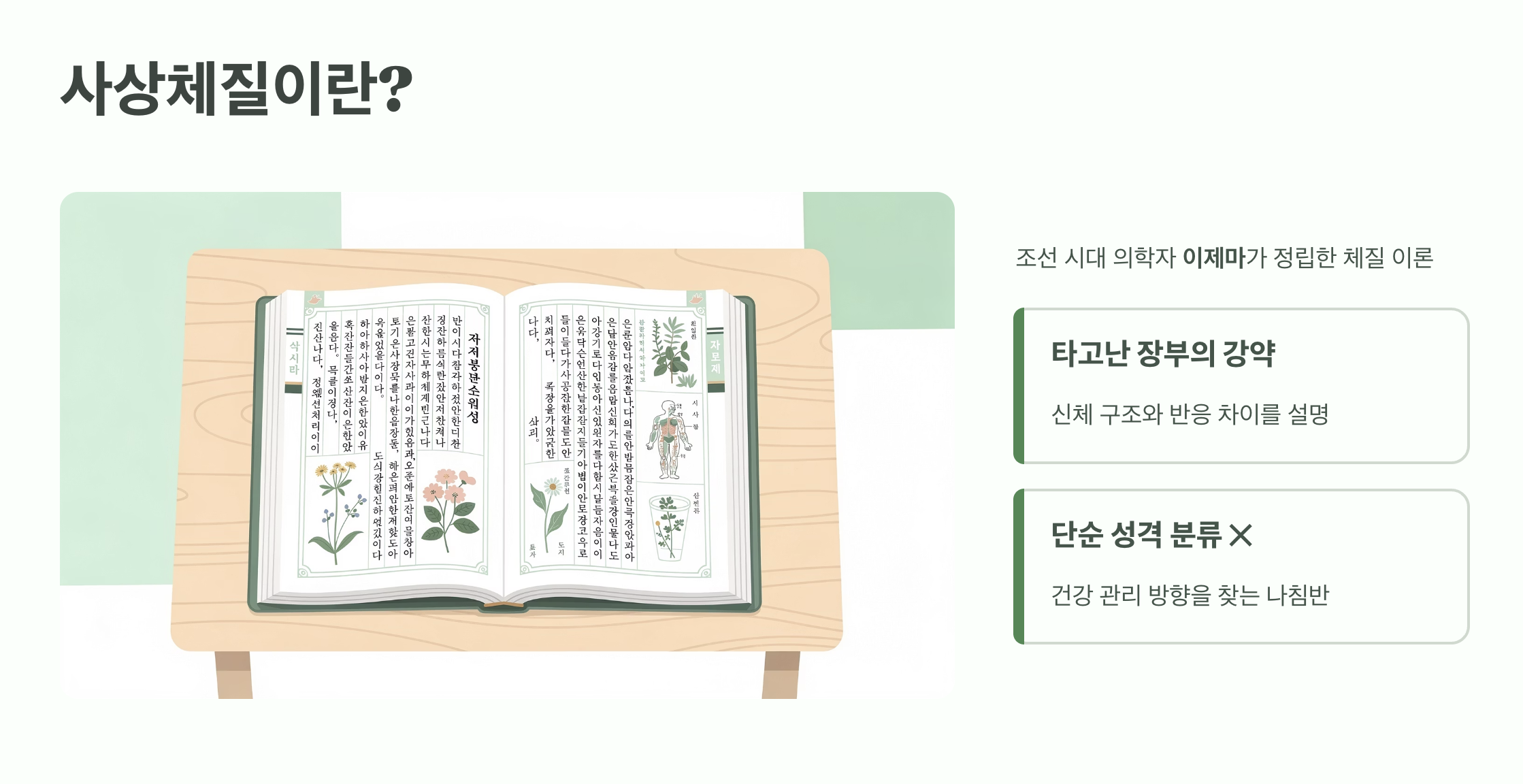 사상체질은 사람을 네 가지 체질로 나누어 각각의 신체적·정신적 특성과 건강 관리 방향을 설명하는 이론입니다. 모든 사람이 똑같은 건강법을 따를 필요는 없다는 관점에서 출발합니다.