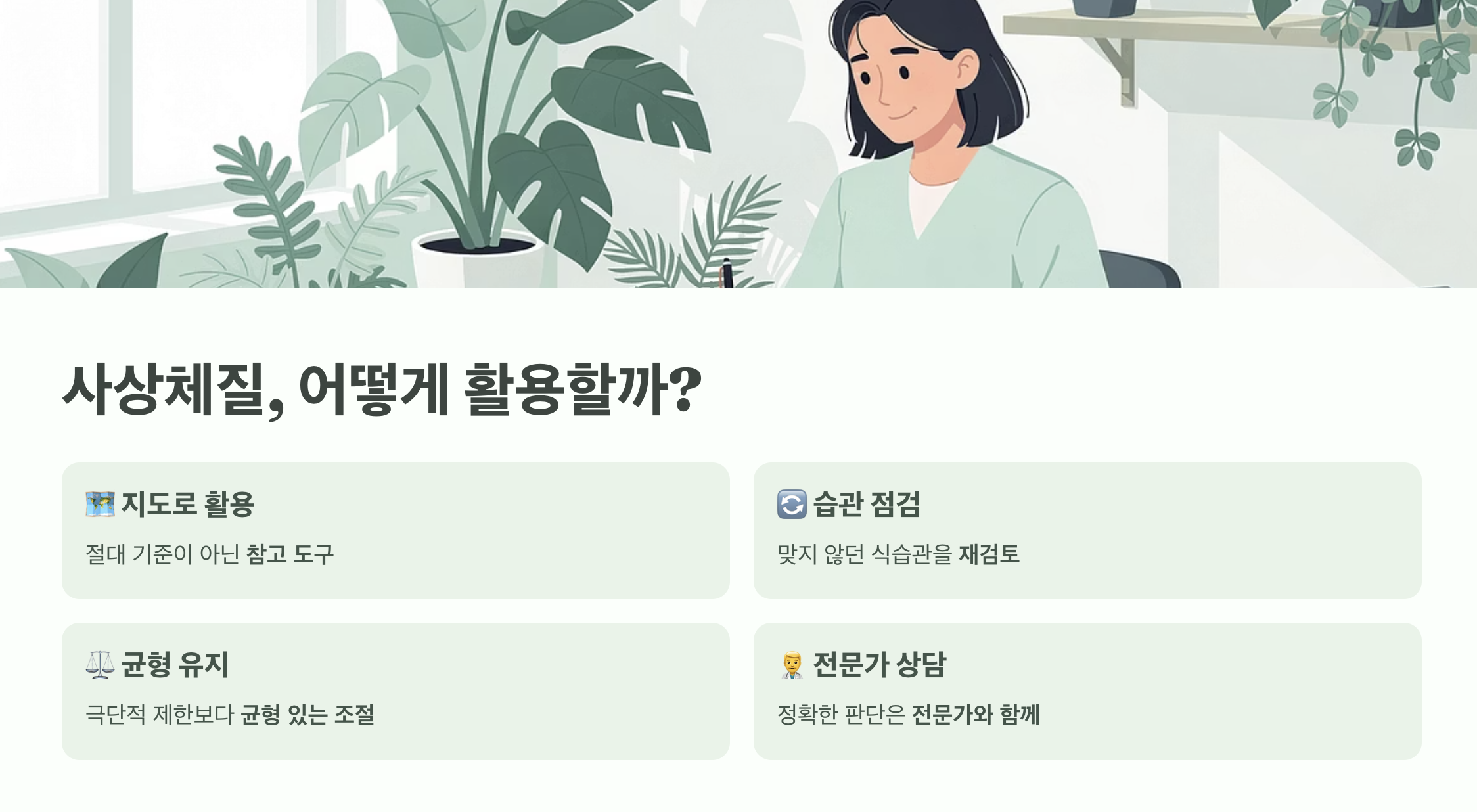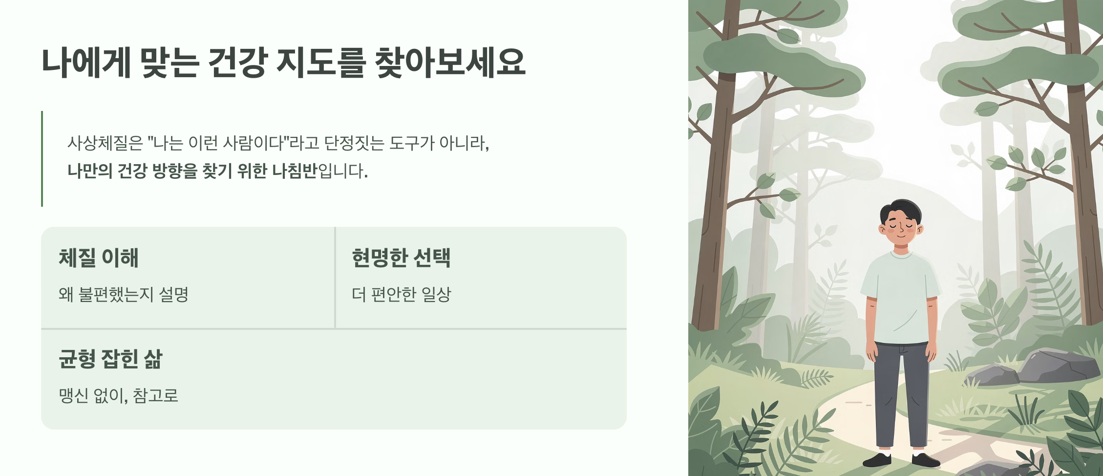 사상체질은 “나는 이런 사람이다”라고 단정짓기 위한 도구가 아니라, 나에게 맞는 건강 관리 방향을 찾기 위한 하나의 지도입니다.