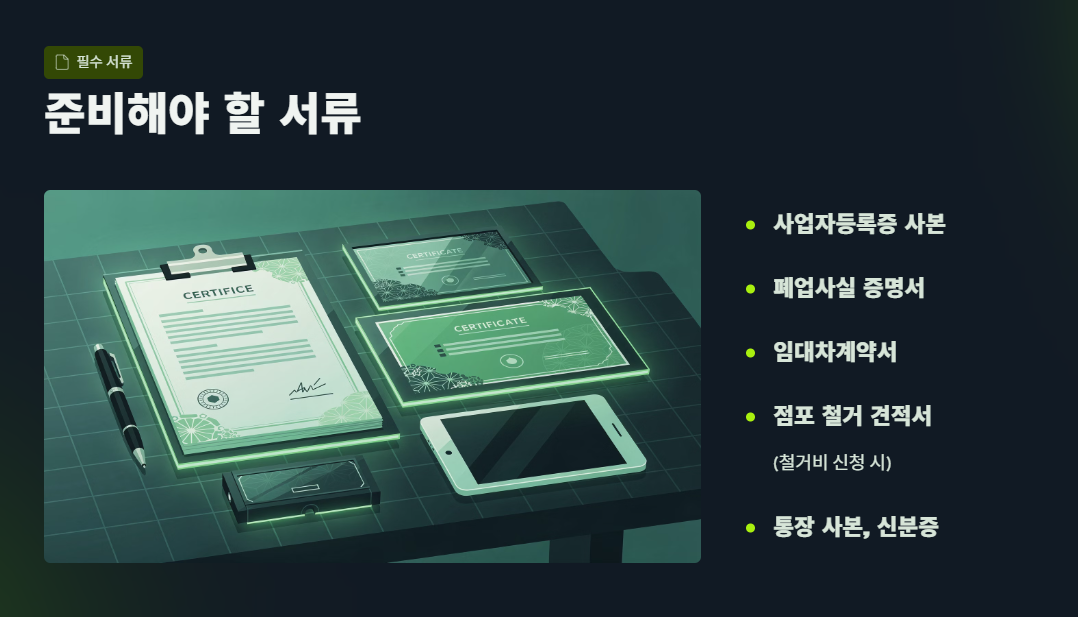 특히 철거비·전직 장려금 등 항목별 제출 서류를 정확히 준비하면 승인 가능성이 높아지고, 재기 준비 교육과 상담까지 받을 수 있는 기회가 됩니다.