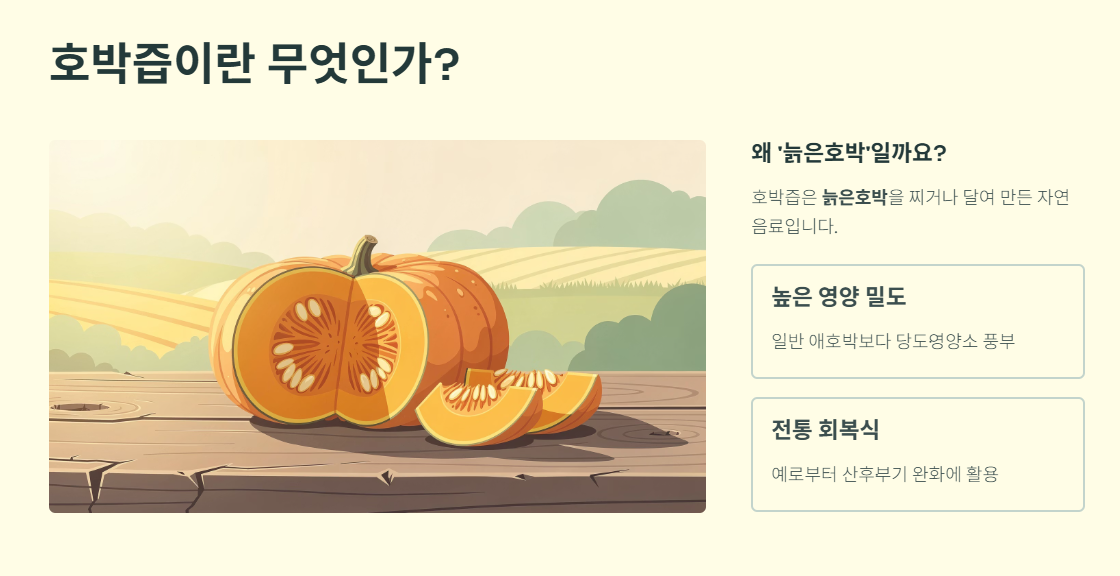 호박즙은 주로 늙은호박을 찌거나 달여서 만든 자연 음료입니다. 늙은호박은 일반 애호박보다 당도와 영양 밀도가 높고, 예로부터 산후 회복식, 부기 완화 식품으로 활용되어 왔습니다.