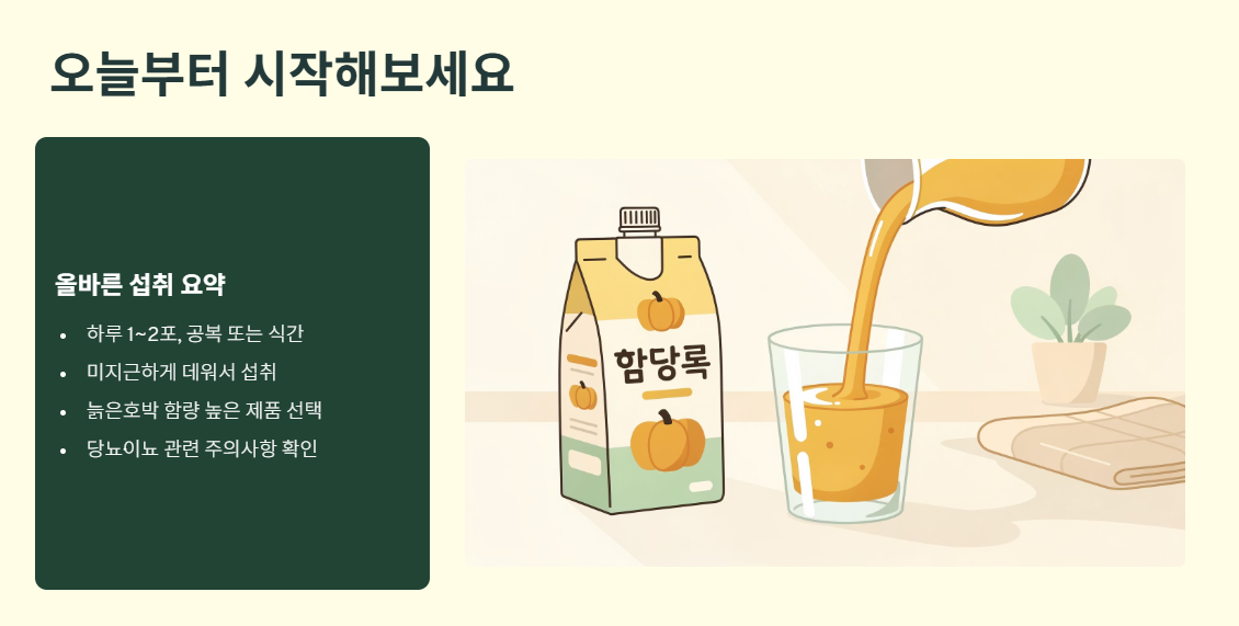 호박즙은 단기간 다이어트 식품이 아니라, 부기 관리·소화 보조·회복기 영양 보충에 천천히 도움을 줄 수 있는 자연 식품입니다.