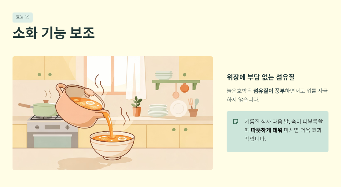 늙은호박은 섬유질이 풍부하면서도 위장에 부담이 적은 식품입니다. 호박즙 형태로 섭취하면 위를 자극하지 않으면서 속을 편안하게 해 주는 역할을 할 수 있습니다.