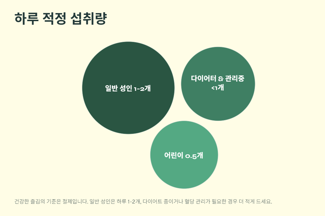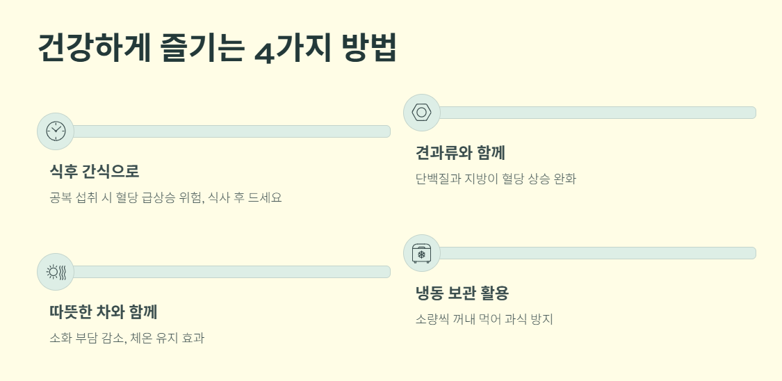 특히 다이어트 중이거나 혈당 관리가 필요한 분들은 하루 섭취량을 지키면서 건강한 방법으로 즐기시길 바랍니다.