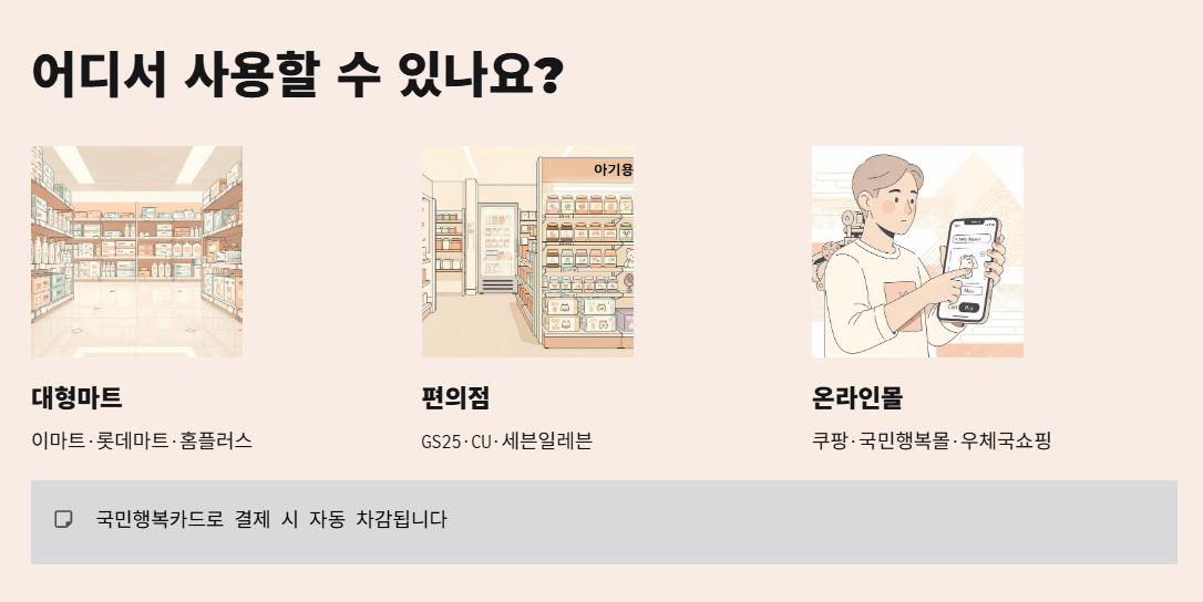 카드사(국민카드, 신한카드, 삼성카드 등)에 따라 일부 사용처가 다를 수 있으므로 사전에 확인하는 것이 좋습니다.