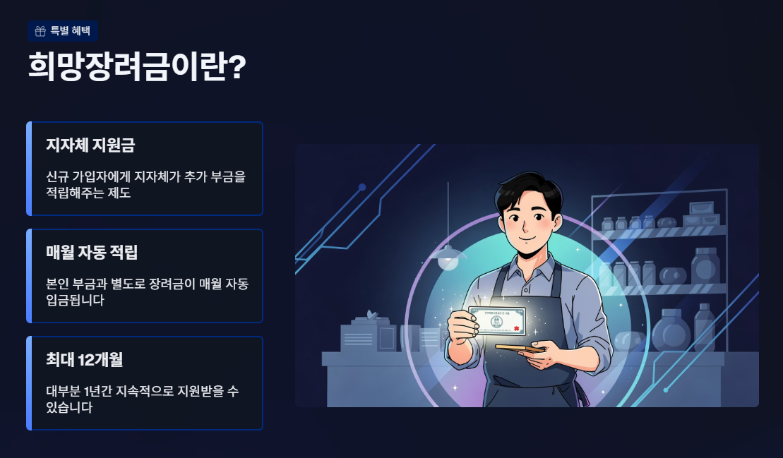 “희망장려금”은 노란우산 신규 가입 시 지자체가 일정 금액을 추가로 적립해주는 정책으로, 광역 및 기초지자체별로 월 1만~3만 원을 지원하는 경우가 대부분입니다.