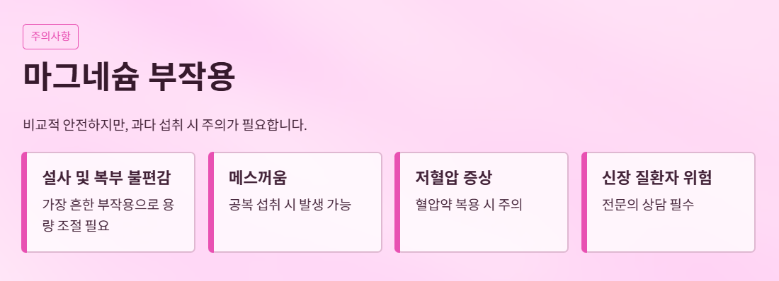 마그네슘은 비교적 안전한 미네랄이지만, 과다 섭취 시 다음과 같은 부작용이 나타날 수 있습니다.