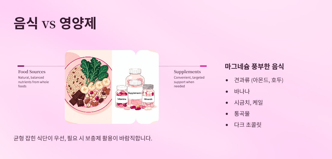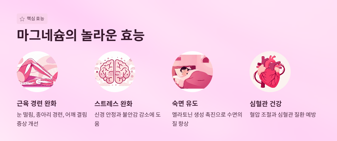 - 마그네슘은 근육, 신경, 수면, 심혈관 건강에 중요한 미네랄