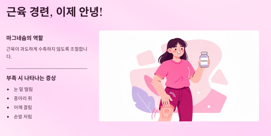 마그네슘은 근육이 과도하게 수축하지 않도록 조절하는 역할을 합니다. 부족할 경우 눈 떨림, 종아리 경련, 어깨 결림 같은 증상이 나타날 수 있습니다.