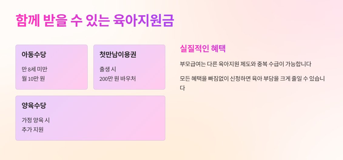 부모급여는 다른 육아지원 제도와 함께 받을 수 있어 실질적인 체감 혜택이 큽니다.