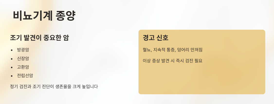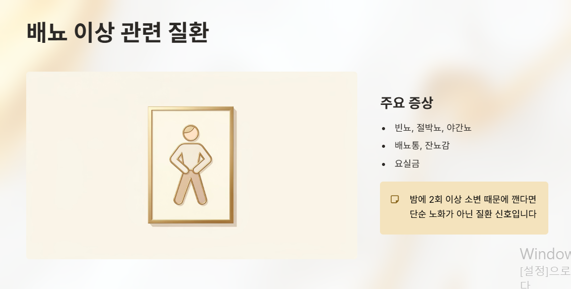 특히 밤에 2회 이상 소변 때문에 깬다면 단순 노화가 아닌 질환 신호일 수 있습니다.