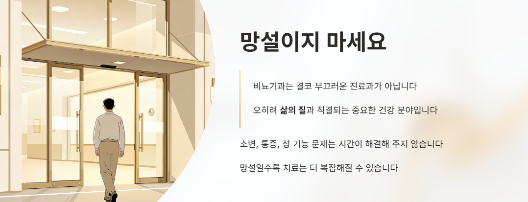 소변, 통증, 성 기능 문제는 시간이 해결해 주지 않습니다. 망설일수록 치료는 더 복잡해질 수 있습니다.