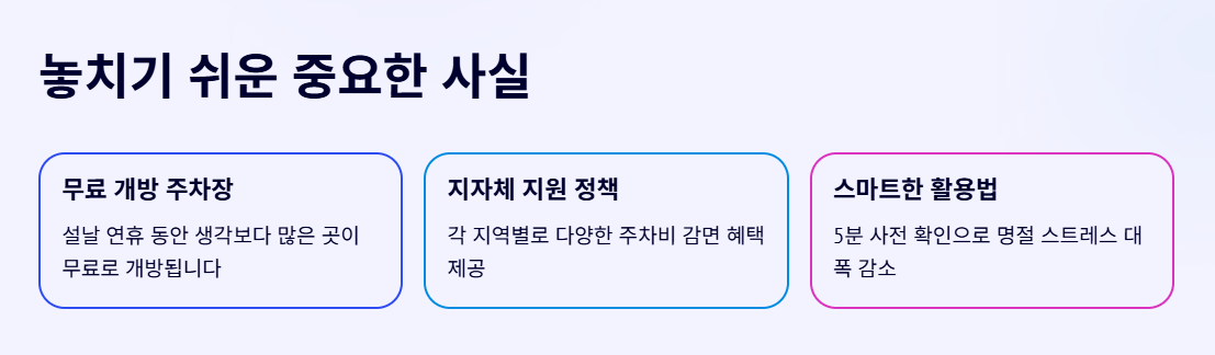 특히 출발 전 5분만 투자해 무료 주차 가능 여부를 확인하는 습관이 설날을 훨씬 편안하게 만들어 줍니다.