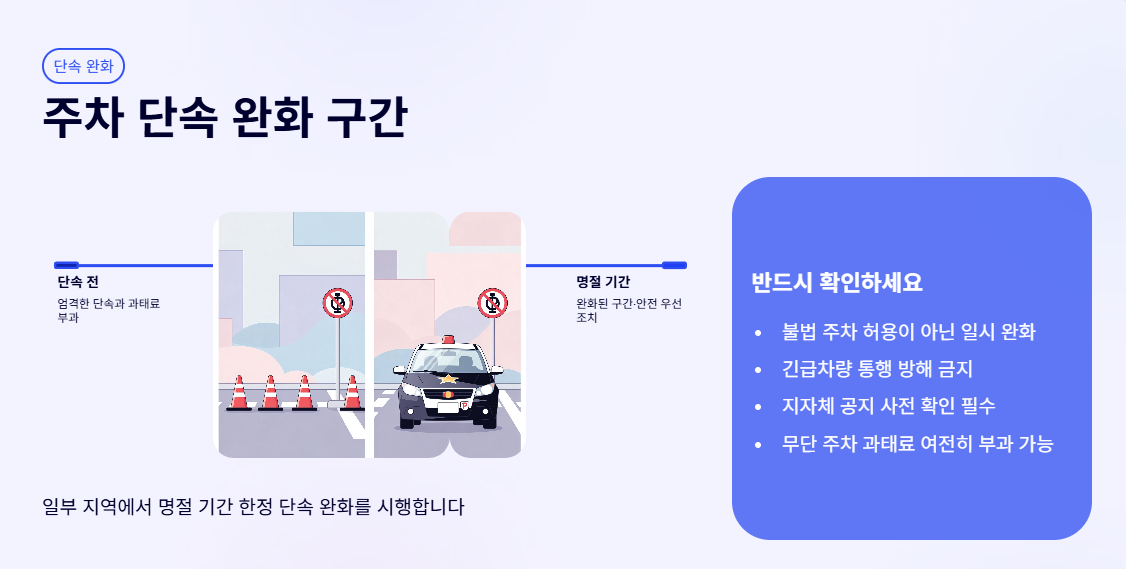 설날에는 일부 지역에서 주차 단속을 일시적으로 완화하기도 합니다. 단, 이는 불법 주차를 허용한다는 의미는 아니며 긴급차량 통행이나 안전에 지장이 없는 구간에 한해 적용됩니다.