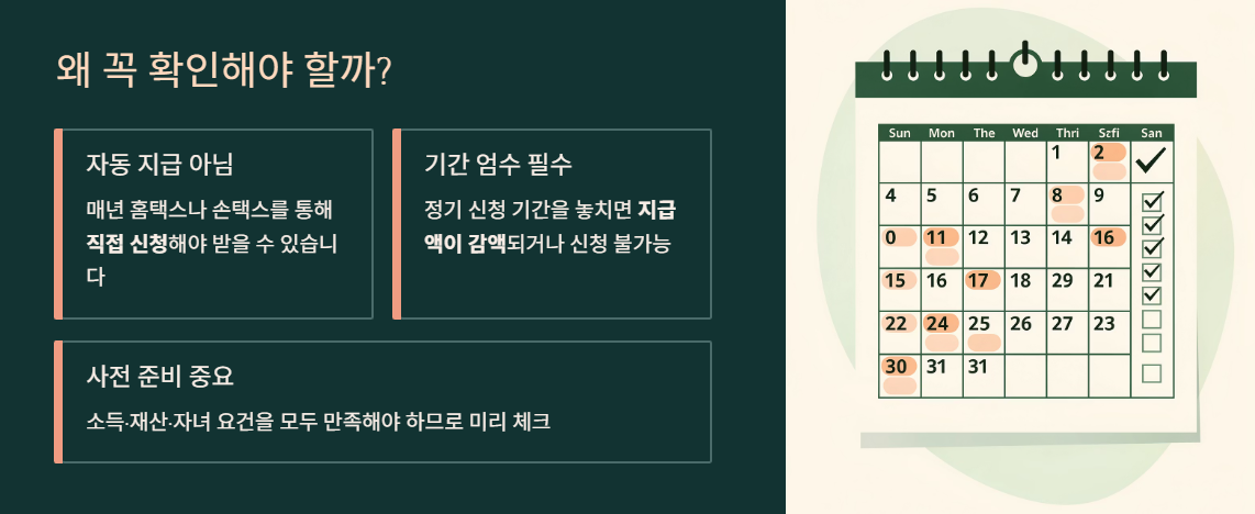 “자녀장려금은 조건에 맞으면 자동으로 주는 돈”이 아닙니다. 매년 홈택스나 손택스를 통해 직접 신청해야 받을 수 있습니다. 정기 신청 기간을 놓치면 지급액이 감액되거나 신청 자체가 불가능해지는 경우도 있기 때문에 정확한 정보를 아는 것이 중요합니다.