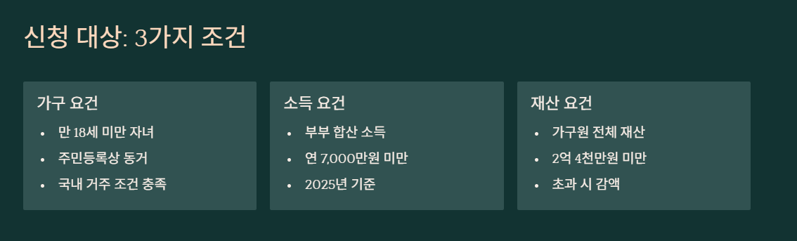기본적으로는 만 18세 미만 자녀가 있어야 신청 대상입니다.