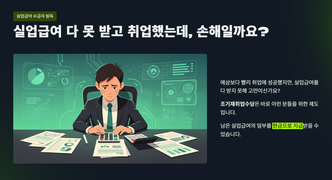 이런 분들을 위해 정부에서는 조기재취업수당이라는 제도를 운영하고 있습니다. 하지만 조건이 까다로워 보인다는 이유로, 또는 제도를 몰라서 수백만 원을 그대로 놓치는 경우도 적지 않습니다.